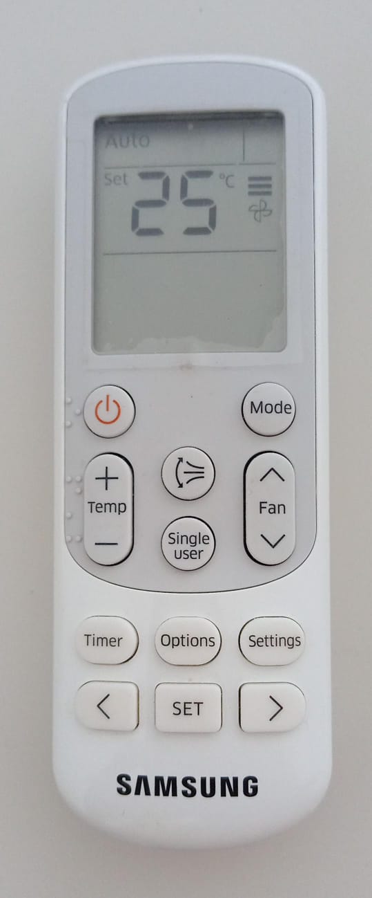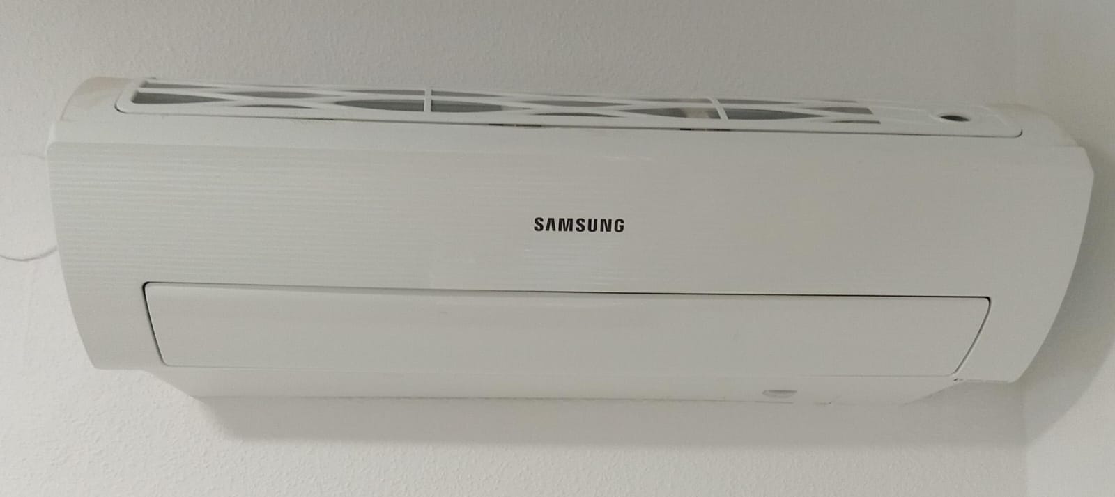 The model name of the air condition in the living room is "AR09JSFNCWKN" produced by Samsung.