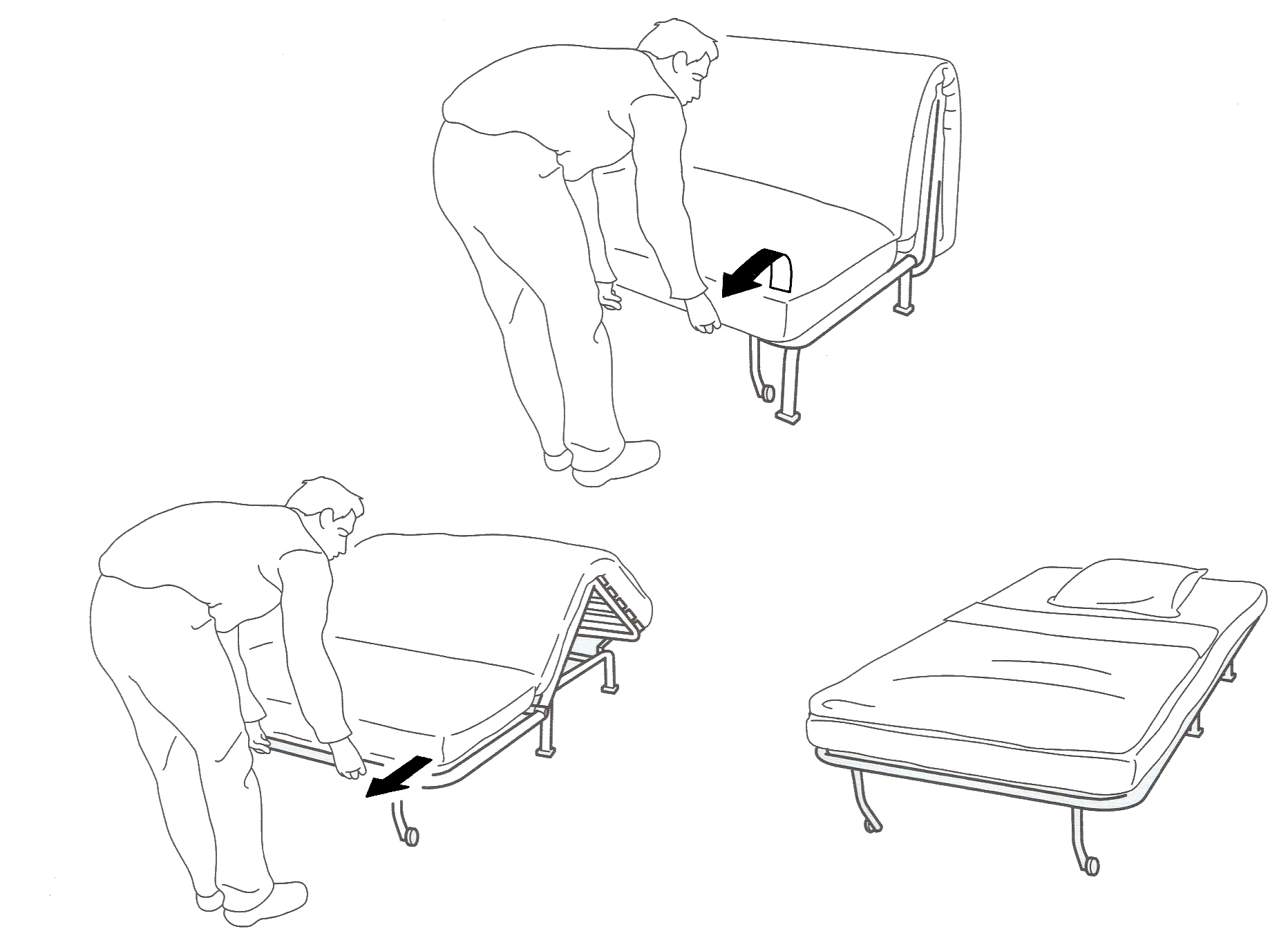 In the Twin Room there is an Armchair which can be converted to a Bed. The following instructions illustrade how to open the Bed: