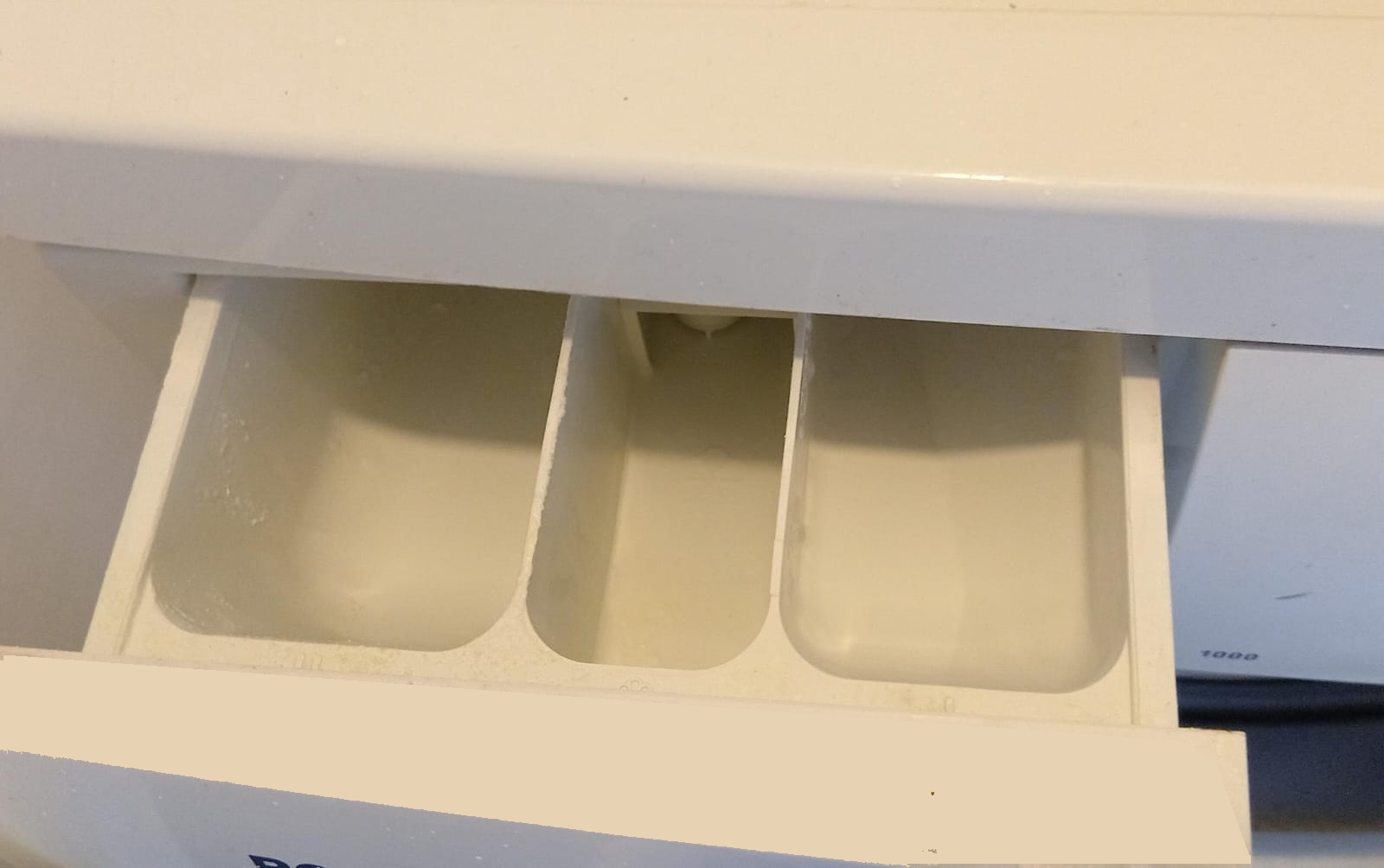 Open the slide on the left to access the three containers for detergents. The left container ("II") is for the main washing routine. The one on the right ("I") for pre-washing. In the small container in the center you could put a softener, if you like. So, please make sure to always put detergent into the left container. Only in case you choose a program with pre-washing you have to put detergent into the right container. To put a softener is optional for all programs.